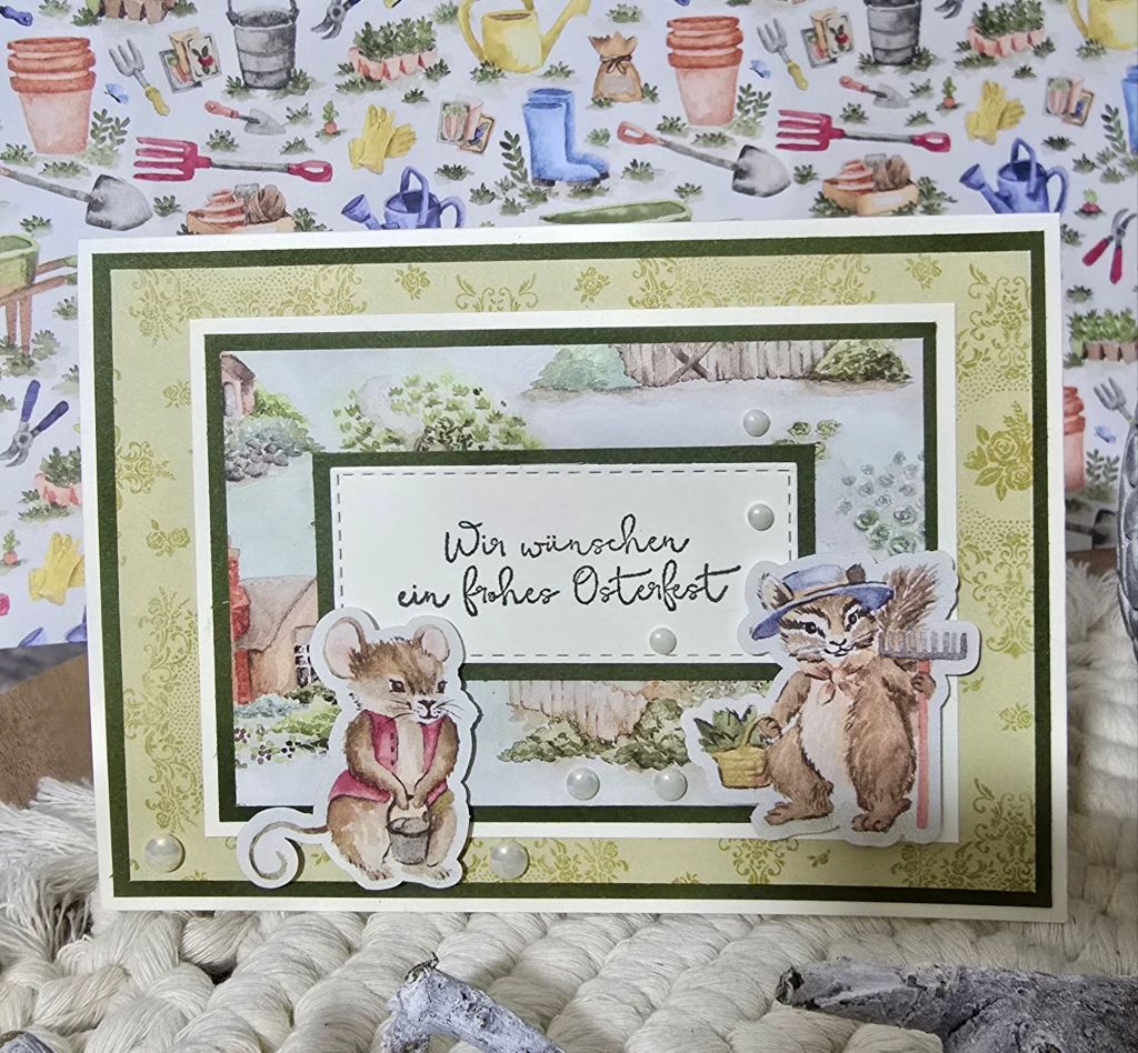 Ich habe das Designpapier als Hintergrund wirken lassen, die Gartenlandschaft in Szene gesetzt und einzelne Tierchen ausgestanzt und ergänzt. Mehr brauchte es gar nicht. Das Papier bringt so viel Stimmung mit, dass es die Gestaltung fast von allein übernimmt.